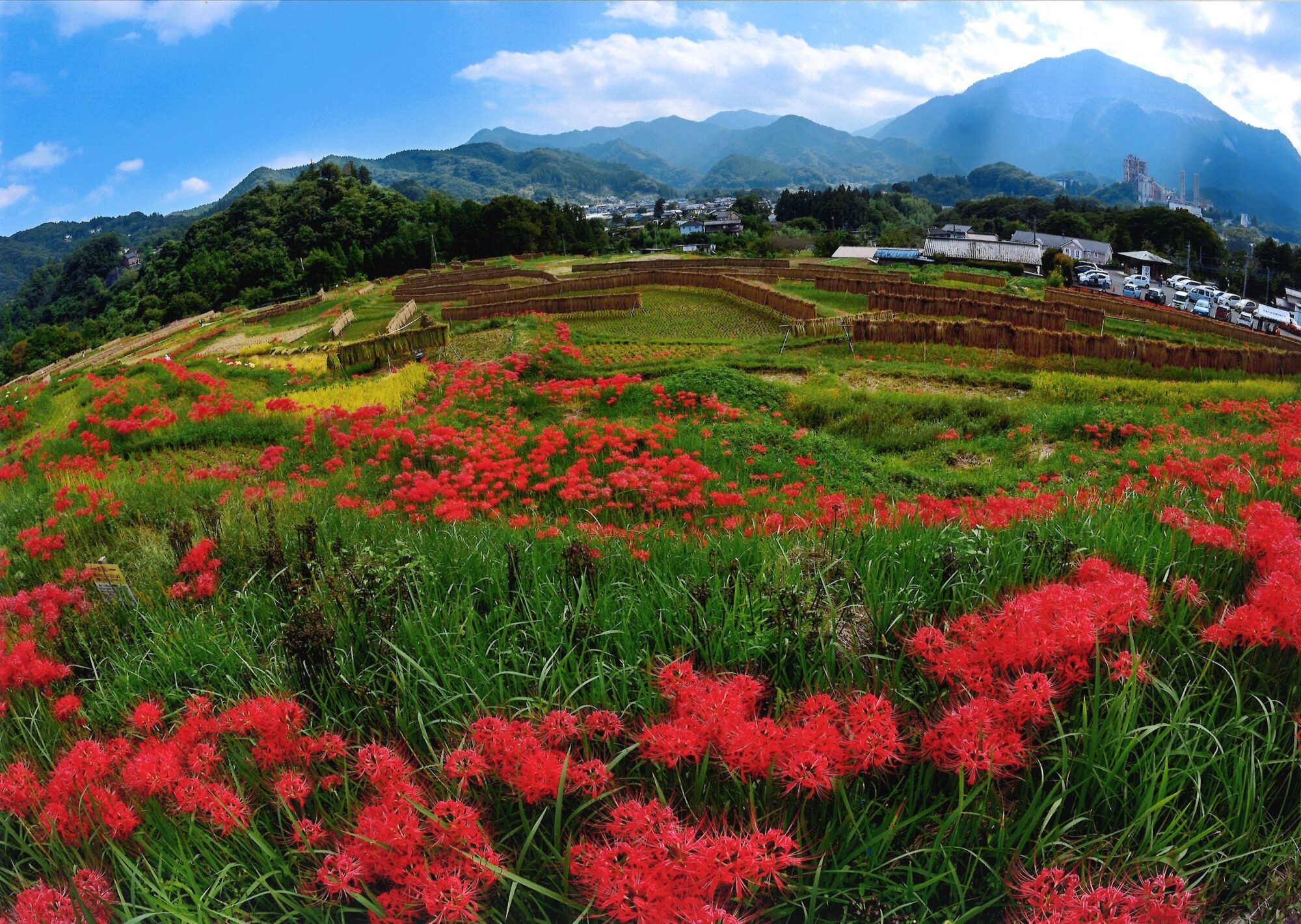 | 撮影者コメント | 彼岸花も咲き誇り、収穫をむかえた寺坂棚田と武甲山の共演です。 |
