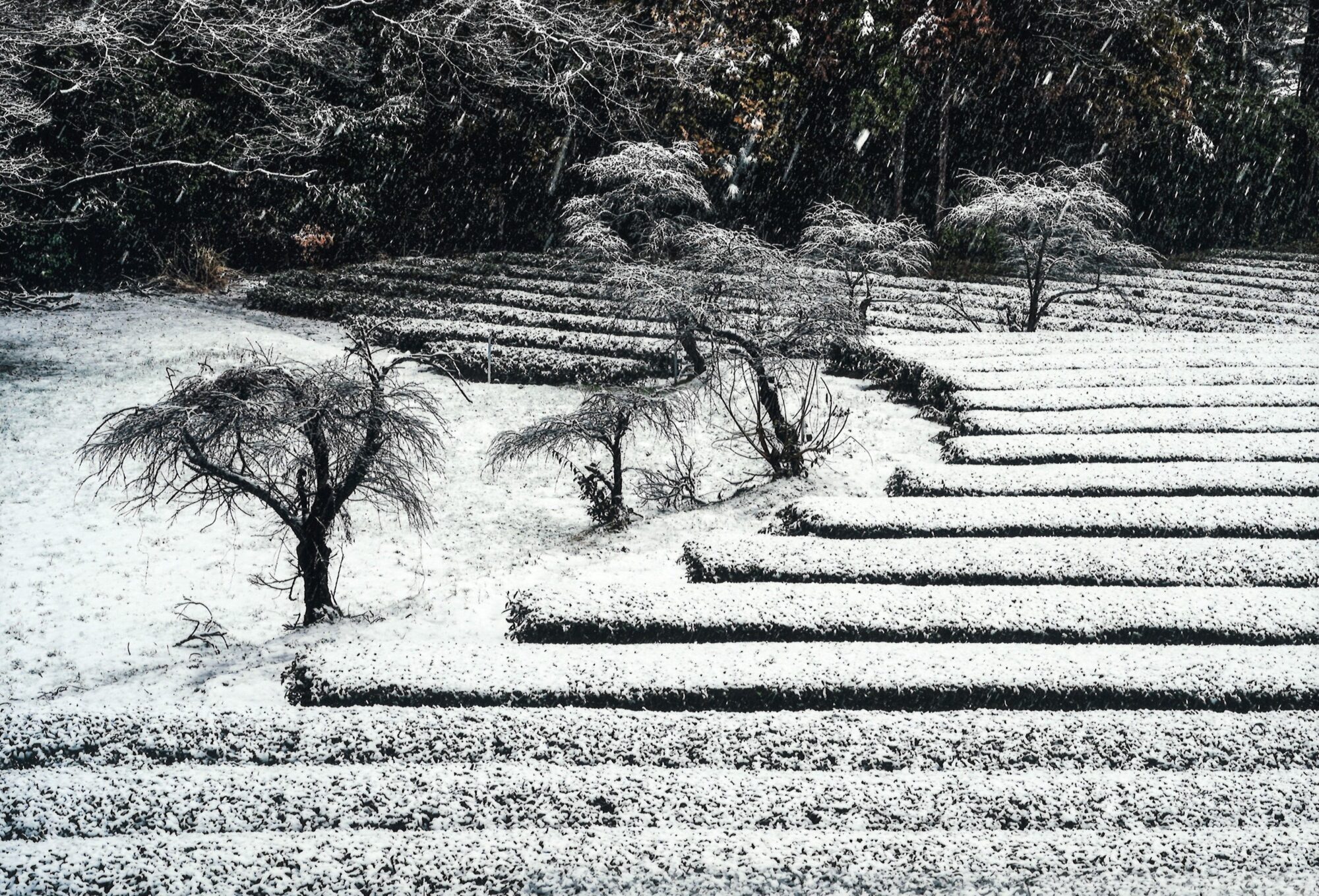 | 講評 | 作者はこの時を待っていたのでしょうね。茶畑の横のライン、端の曲線、立木の有様など画面構成がしっかりしていて、安定感があります。雪が降っている様子まで捉えたのはイメージどおりだったのでしょうか。日本画を見ているようでした。 |