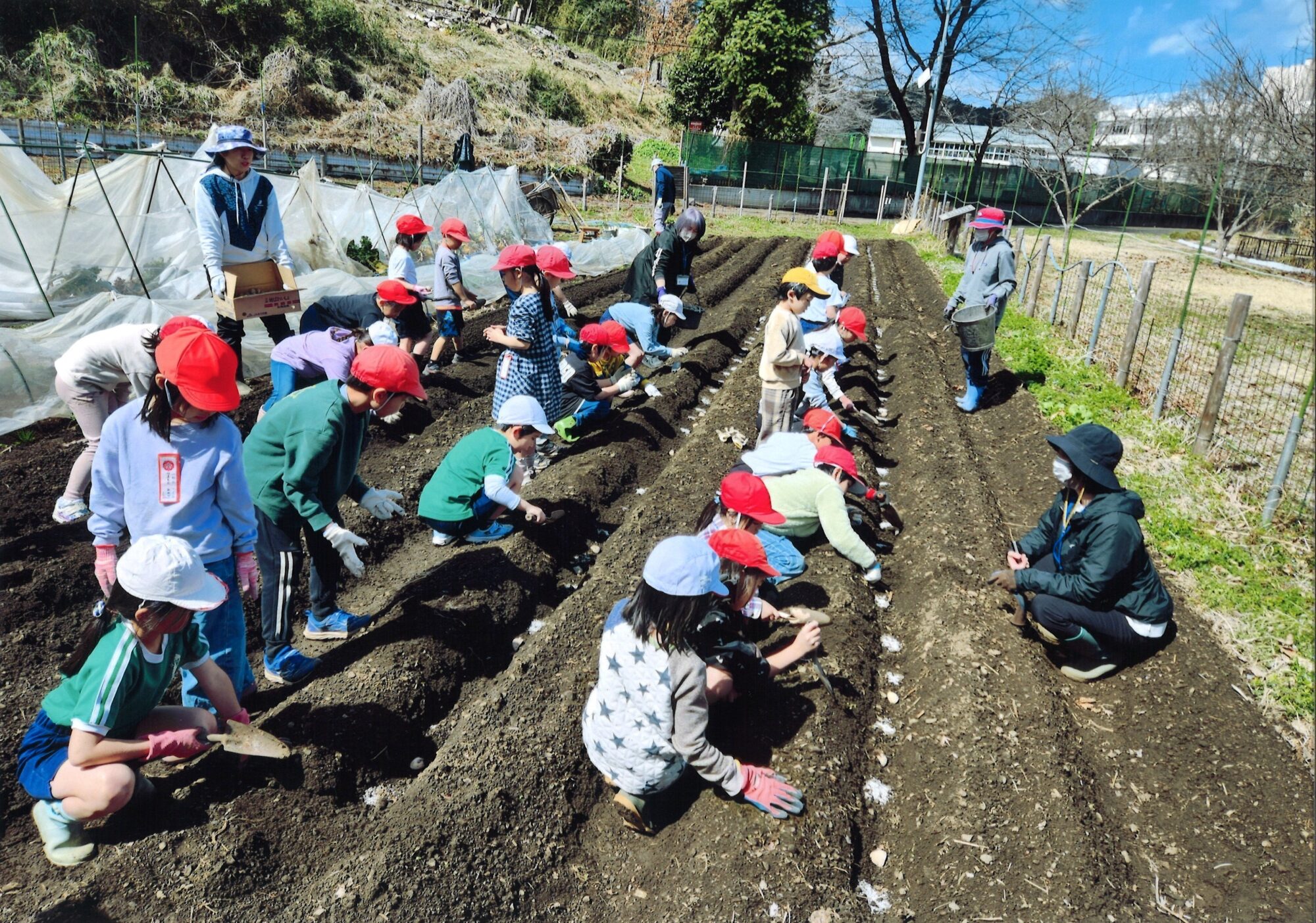 | 撮影者コメント | 小学1年生、2年生がジャガイモまき体験を行っているところです。 |
