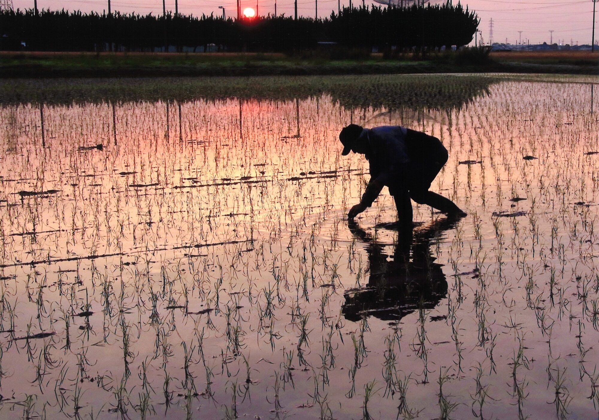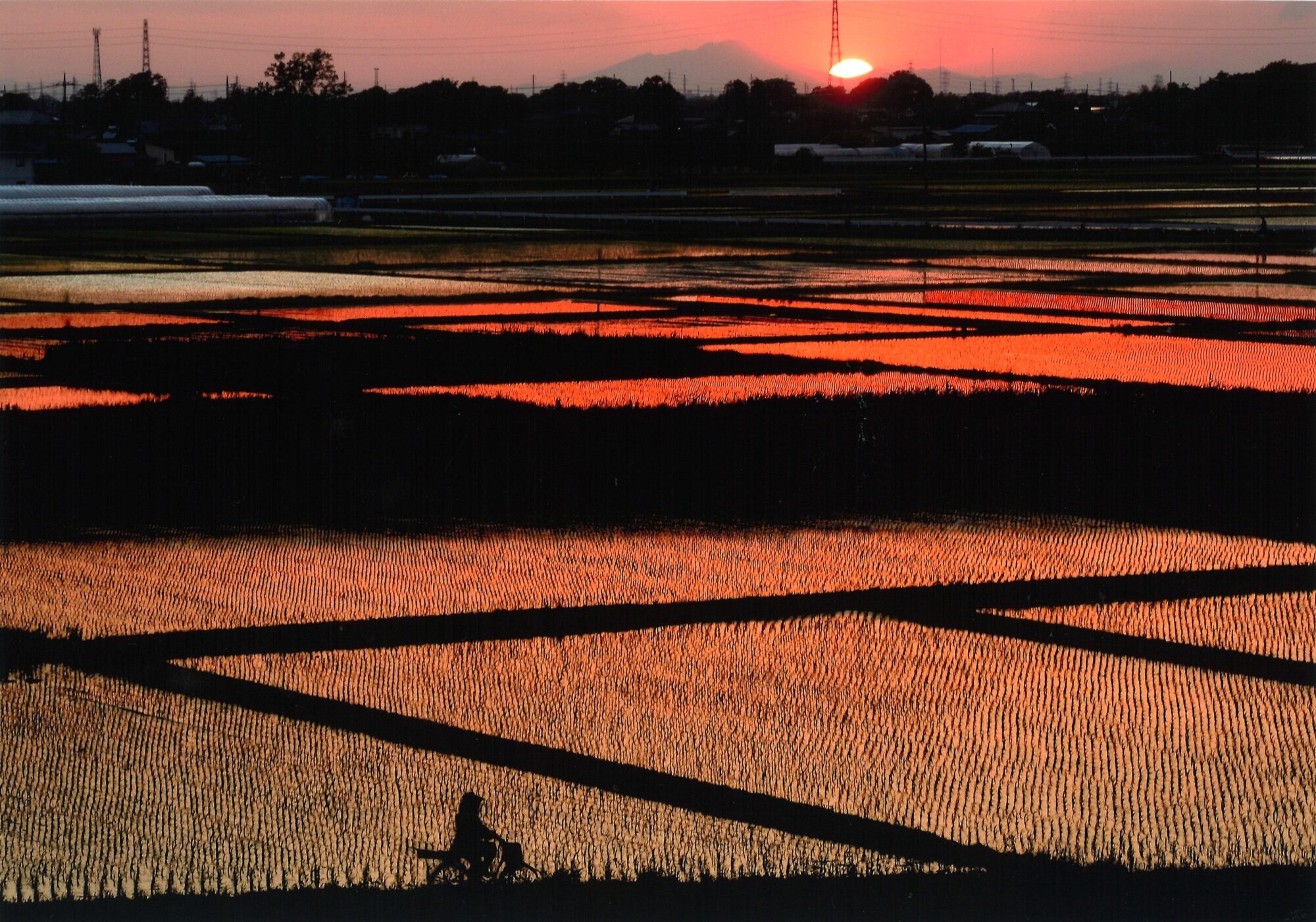 | 講評 | 撮影条件が揃いました。明るさをなくして沈む太陽、水田の映り込み、家路を急ぐ自転車の人。太陽の位置が高かったら中ほどのあぜ道がつぶれたり、手前の早苗がこれほど存在感を見せなかったでしょうね。時間帯を考えて我慢しながら撮った作者に拍手。 |