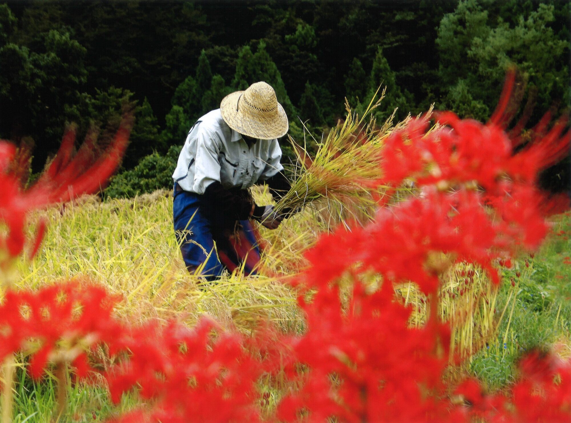 | 撮影者コメント | 秋彼岸の頃。彼岸花に囲まれて稲刈りをする農夫。 |